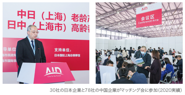 日本貿易振興機構(JETRO)は、AIDに於いて上海市を中心とした福祉・リハビリ事業関係者との商談・交流を目的に「日中( 上海市)高齢者産業交流会」を2015年以降、6回開催してきました。日本企業が有する「自立支援」、「認知症ケア」などの経 験・ノウハウを通じ、今後も一つでも多くの相互の連携や成果が生まれることを期待しています。