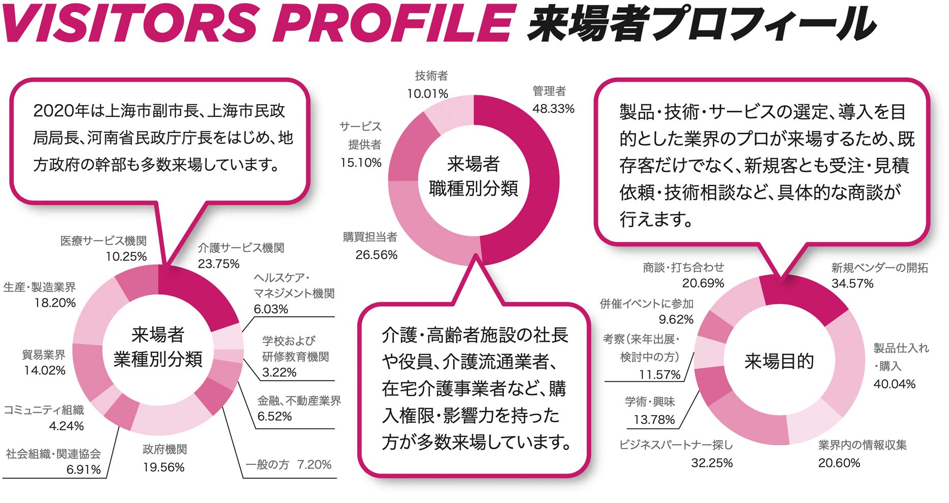 会場には、介護・福祉に関する製品やサービスの導入を 考える質の高い方々が多数来場。来場者とはもちろんの こと、出展者同士でも新たなつながりや事業創出が生ま れやすい環境が整っています。