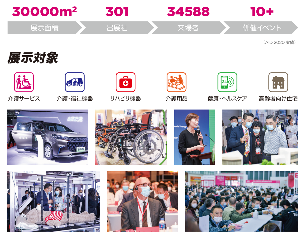 AID(上海国際福祉機器展)は、高齢者・障がい者の生 活を支援するあらゆる製品・技術・サービスが集まる中 国最大規模の介護・福祉展示会です。